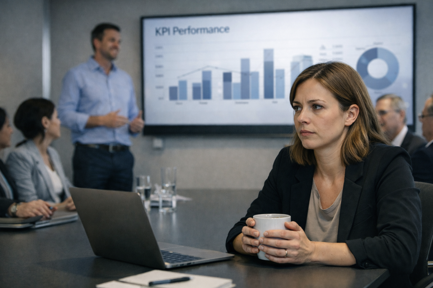Haar duim scrolt door LinkedIn. Tom heeft een post gedeeld over “impact”. Zelfs zijn koffiemok staat zelfzeker op de foto.